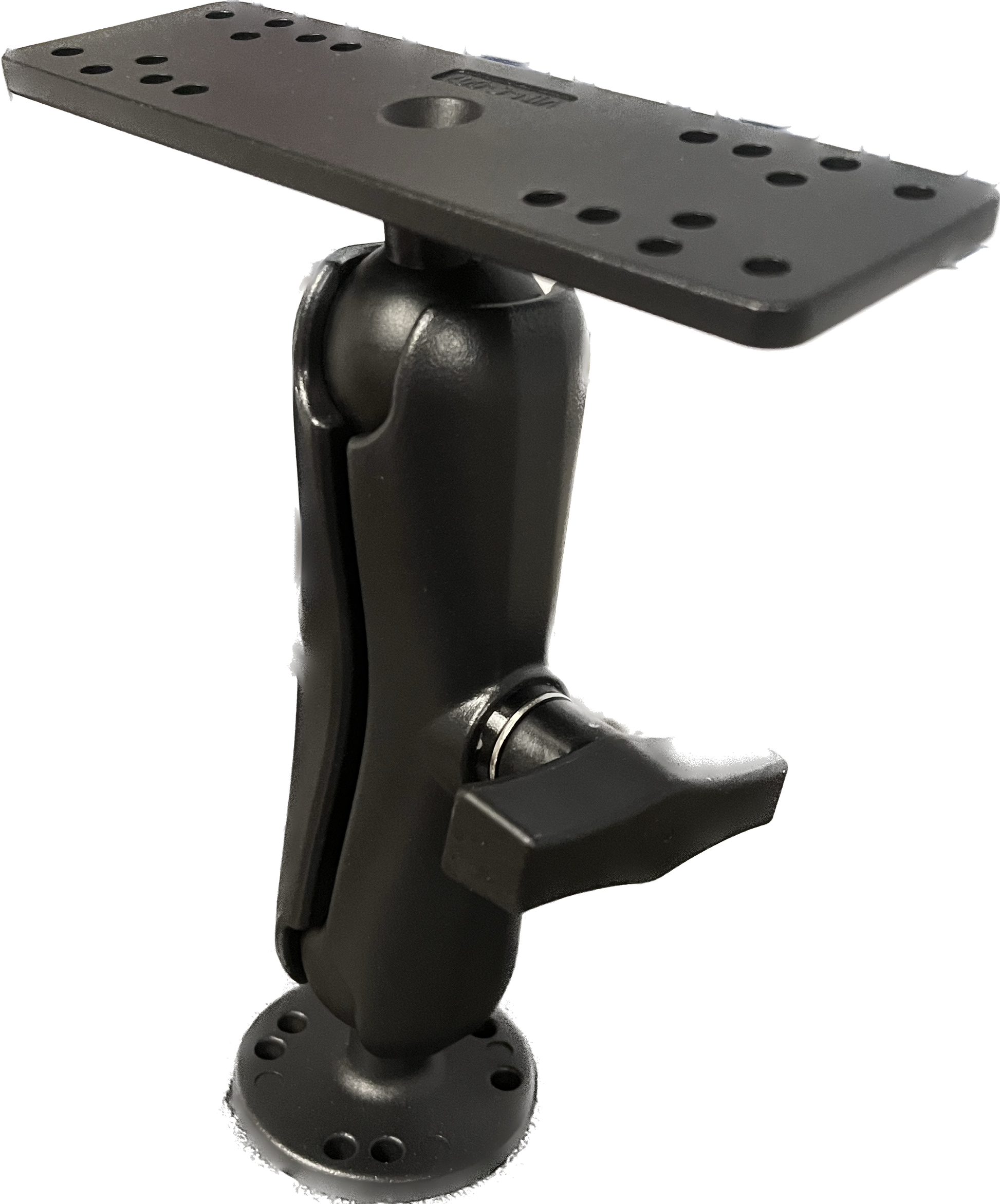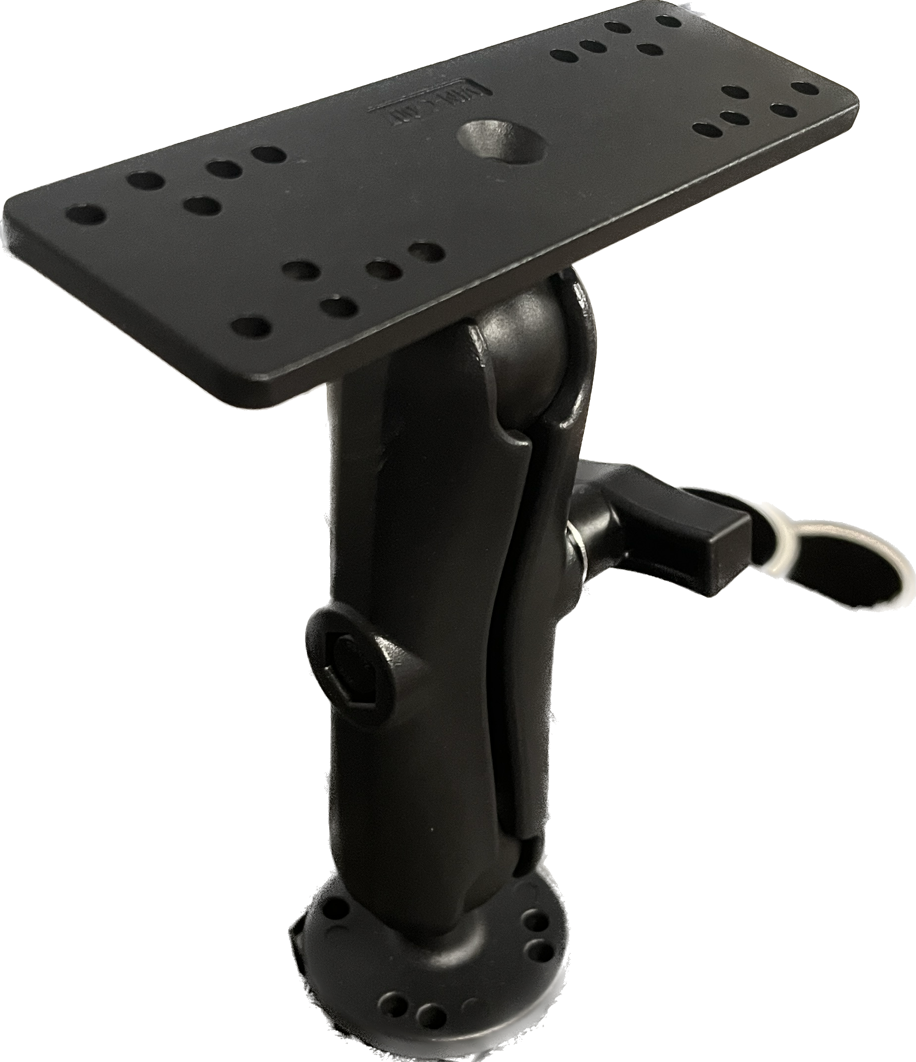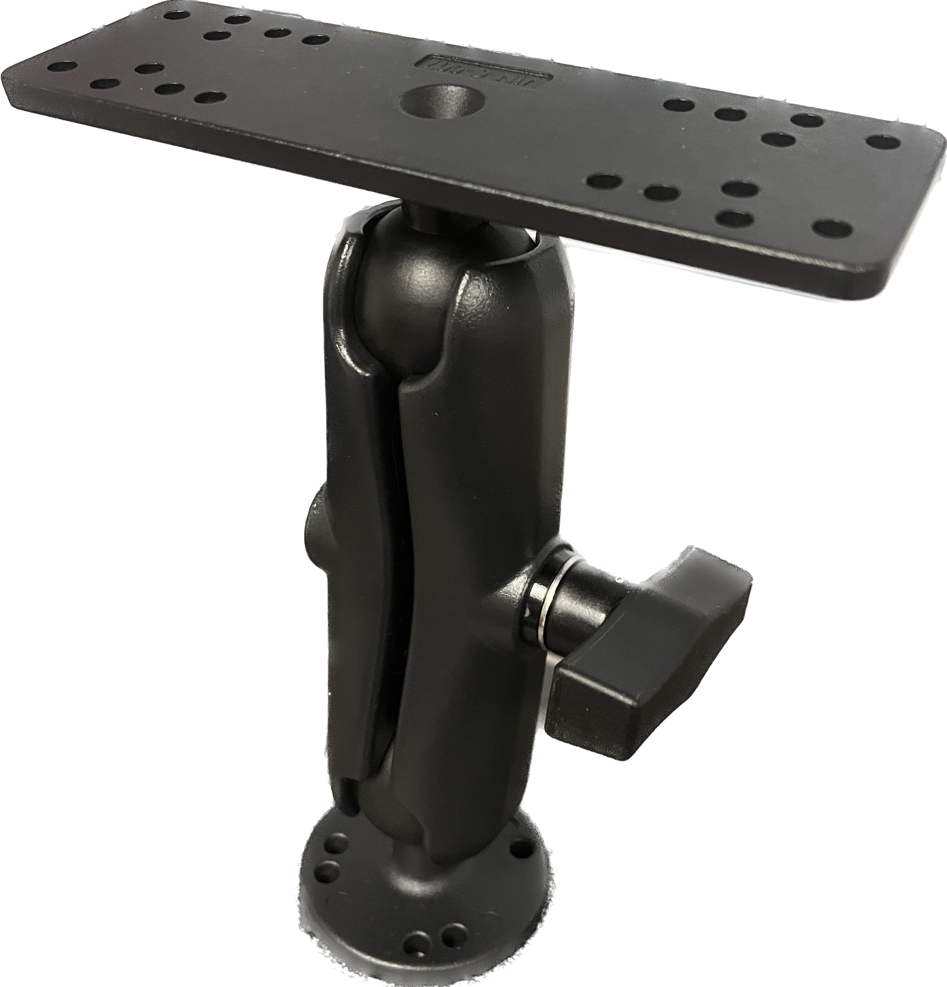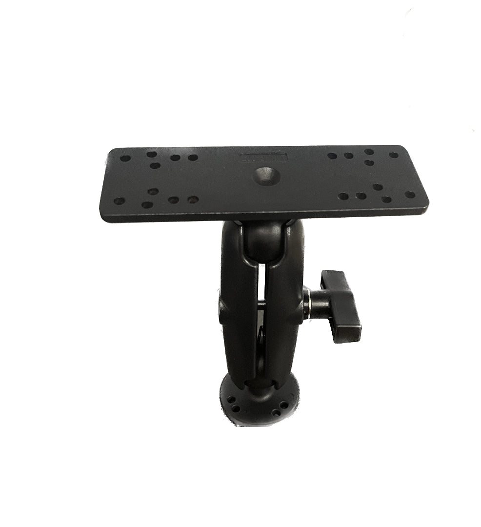 Adjustable / Fold Down Ball Graph Mount. 1.5" Ball Mount for your Graphs mounted on deck, bow, or console in your boat. Mounting Base is 1/5" diameter and the Top Mount is 6.25" x 2" with universal options to mount your gimbal/graph on. 8" tall in the vertical position.