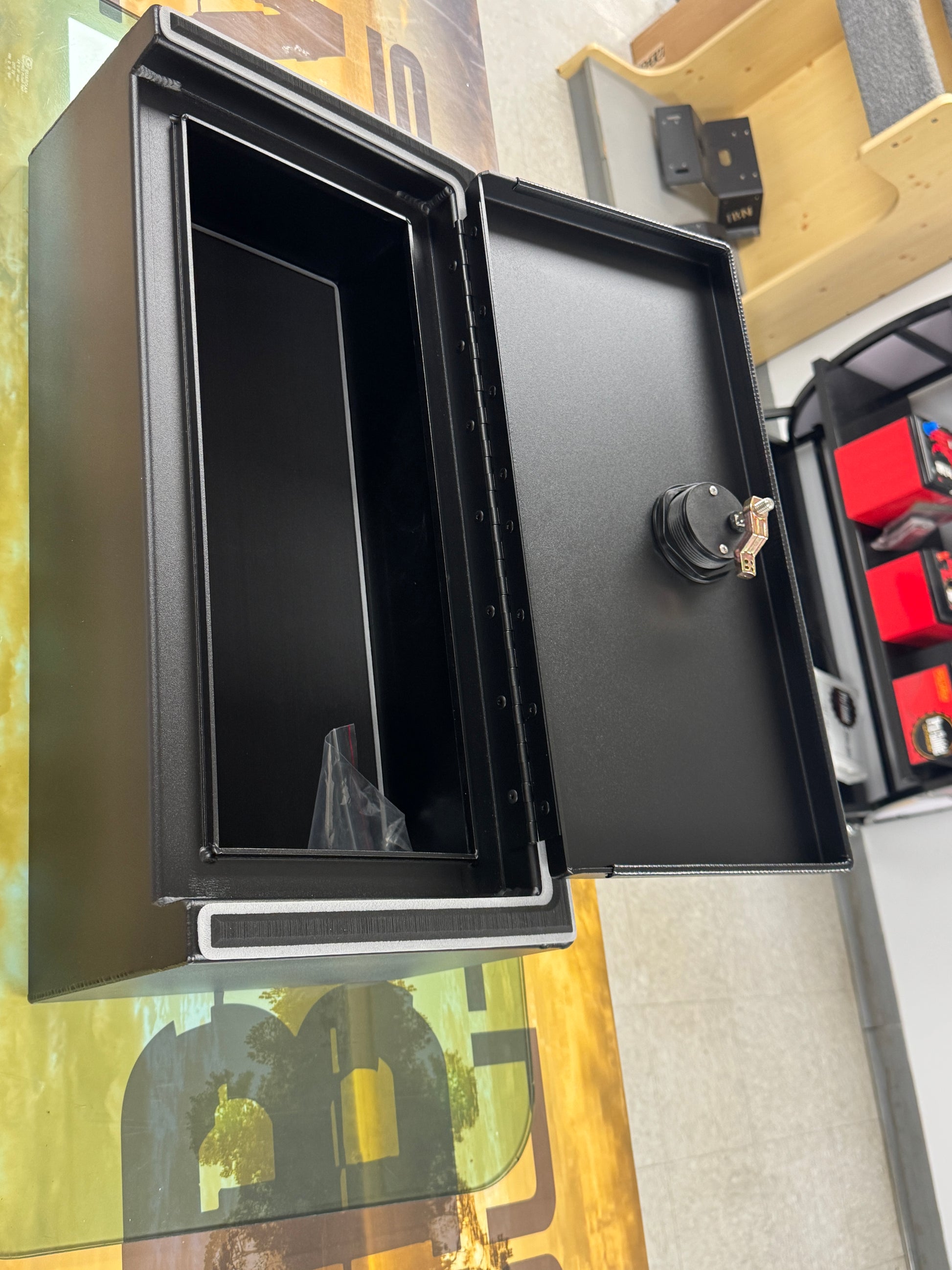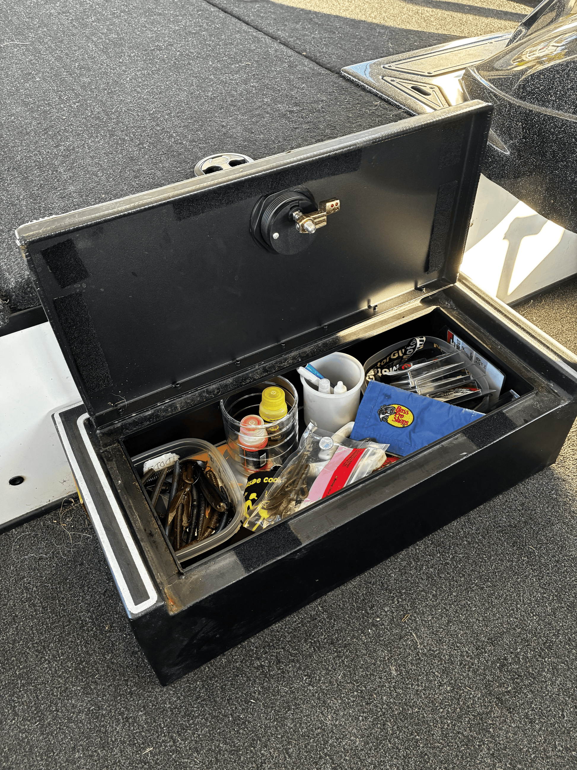 Our newest version of the custom step box, now featuring a dry hatch lid and custom black over charcoal grey EVA foam turf/ruler. Beautiful black poweder coat gives these boxes a long lasting durable finish. Can be added to many boats. Shown in a Ranger 188RT.